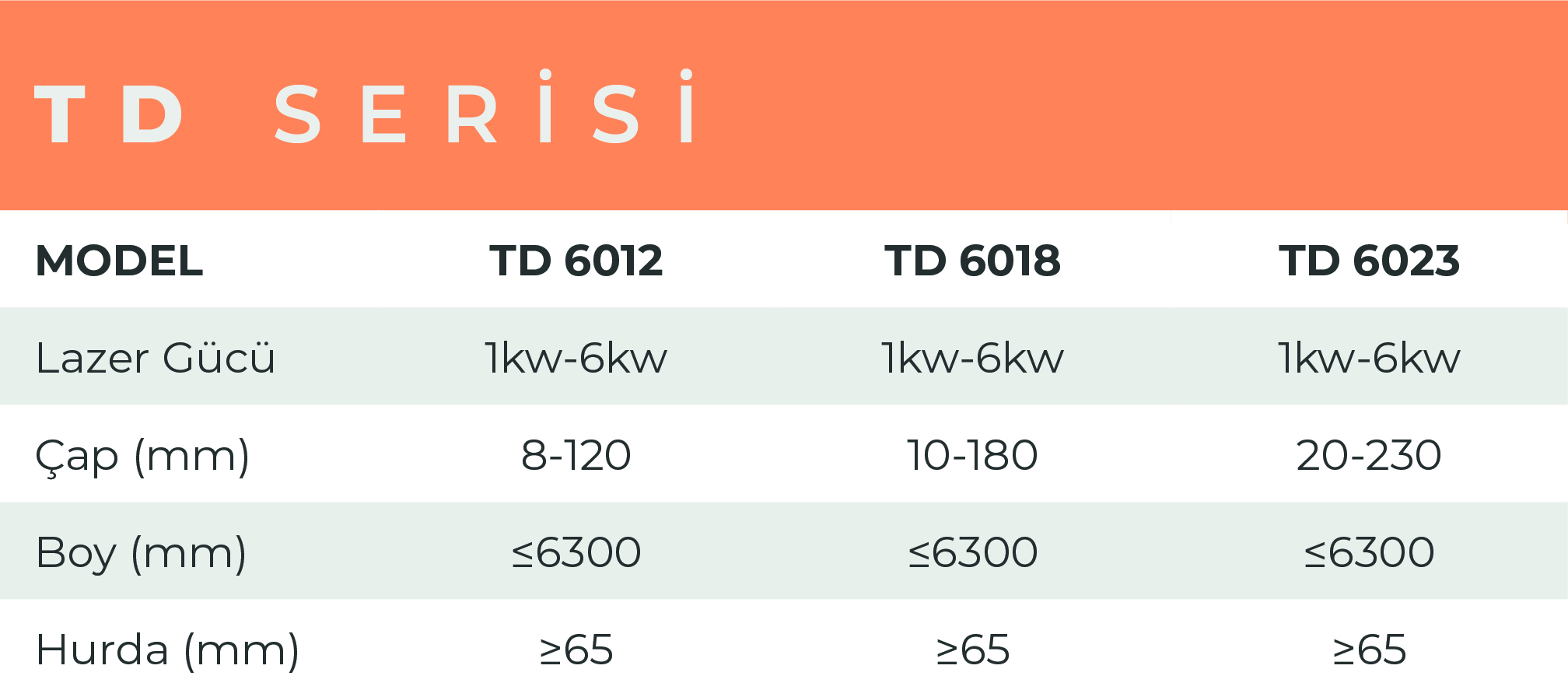 Kullanıcı dostu yapısı ve düşük işletme maliyetleri sayesinde TD Serisi, hafif sanayi uygulamaları, metal işleme atölyeleri ve genel üretim tesislerinde yaygın olarak tercih edilmektedir. Boru lazer kesim süreçlerinde pratik, ekonomik ve güvenilir bir çözüm sunar.