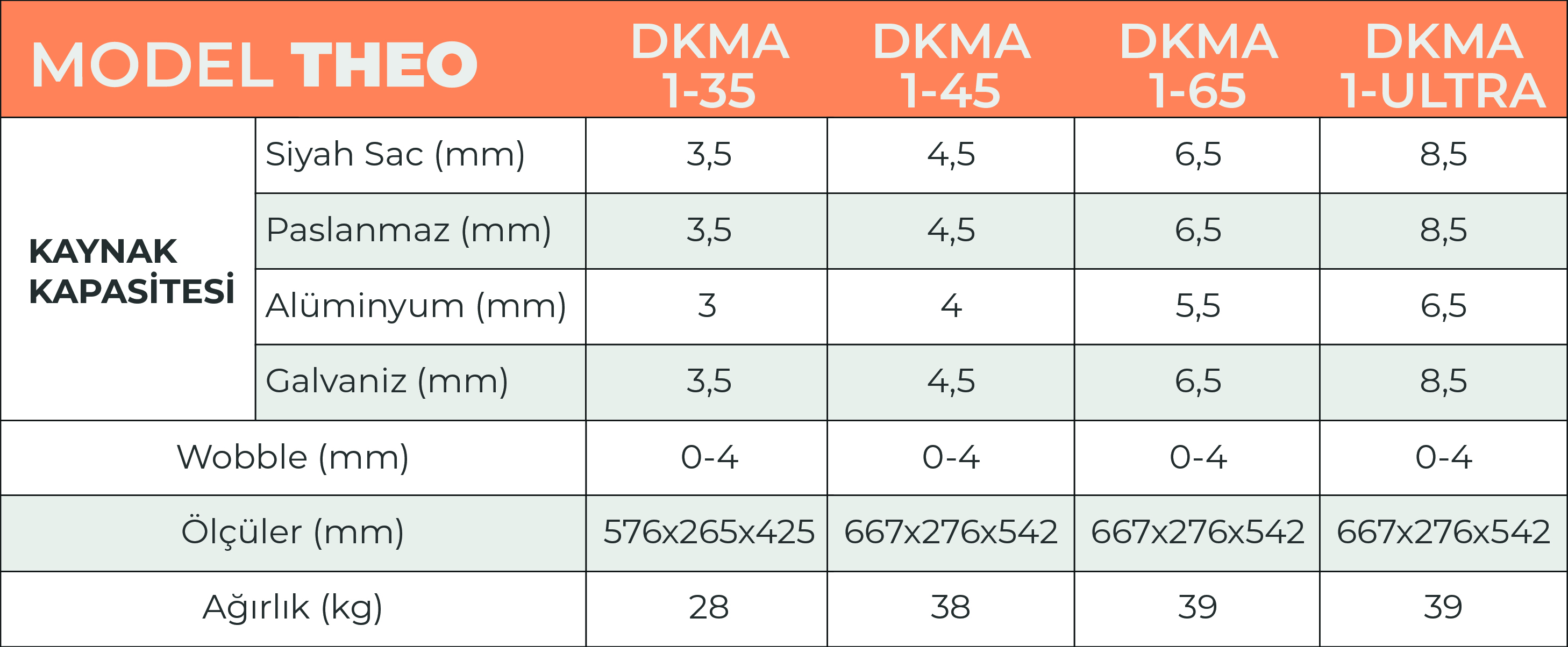 DKMA 1-35, DKMA 1-45, DKMA 1-65 ve DKMA 1-ULTRA model seçenekleri ile THEO Model; karbon çelik, paslanmaz çelik, alüminyum ve galvanizli sac gibi farklı malzemelerde etkin kaynak performansı sağlar. Dengeli güç çıkışı ve ayarlanabilir wobble özellikleri, düzgün ve estetik kaynak dikişleri elde edilmesine yardımcı olur.